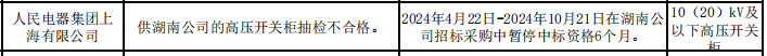 公告显示,人民电器集团上海有限公司,在供湖南公司的高压开关柜抽检不合格。