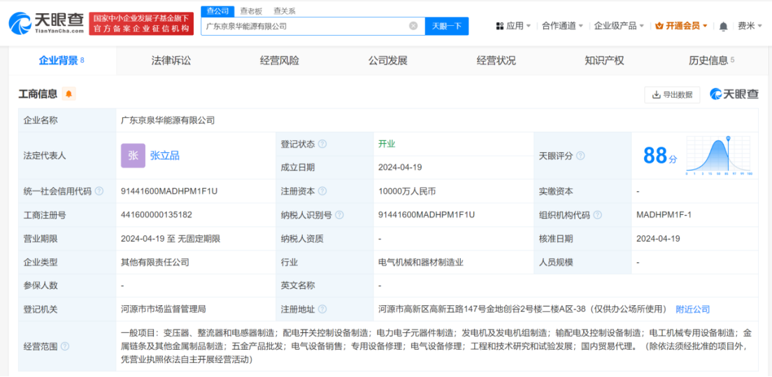 天眼查App显示,近日,广东京泉华能源有限公司成立,法定代表人为张立品,注册资本1亿人民币,经营范围含变压器、整流器和电感器制造、配电开关控制设备制造、电力电子元器件制造、发电机及发电机组制造、输配电及控制设备制造、电工机械专用设备制造等。股东信息显示,该公司由京泉华(002885)和广东锐金电气有限公司分别持股70%、30%。