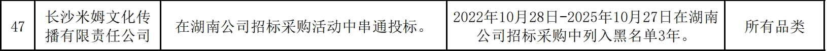 公告显示,长沙米姆文化传播有限责任公司在湖南公司招标采购活动中串通投标。相关处理措施为,2022年10月28日-2025年10月27日在湖南公司招标采购中列入黑名单3年。处理范围为,所有品类。