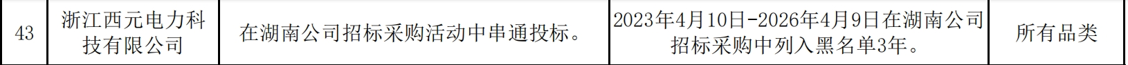 公告显示,浙江西元电力科技有限公司在湖南公司招标采购活动中串通投标。相关处理措施为,2023年4月10日-2026年4月9日在湖南公司招标采购中列入黑名单3年。处理范围为,所有品类。