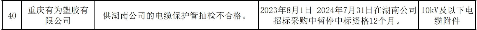 公告显示,重庆有为塑胶有限公司供湖南公司的电缆保护管抽检不合格。相关处理措施为,2023年8月1日-2024年7月31日在湖南公司招标采购中暂停中标资格12个月。处理范围为,10kV及以下电 缆附件。