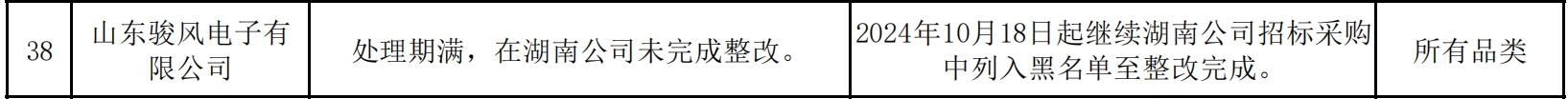 公告显示,山东骏风电子有限公司处理期满,在湖南公司未完成整改。相关处理措施为,2024年10月18日起继续湖南公司招标采购中列入黑名单至整改完成。处理范围为,所有品类。