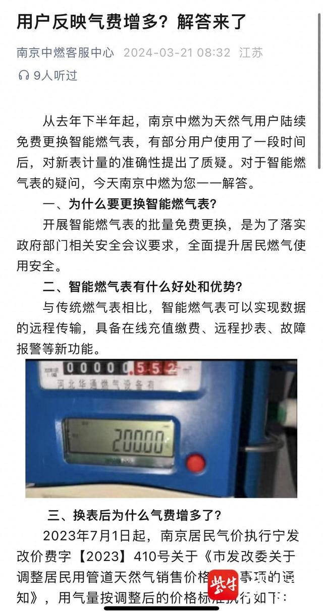 目前,南京主城区燃气由港华燃气供应,江北由中燃燃气供应,江宁由华润燃气供应。从去年下半年起,南京中燃为天然气用户陆续免费更换智能燃气表,有部分用户使用了一段时间后,对新表计量的准确性提出了质疑。对此,南京中燃从3月21日开始,就在其公众号上发表“用户反映气费增多?解答来了”的文章。其中也主要提出价格调整使得气费增加,还提到“实际上,冬季用气量增多、人工抄表误差以及旧表零部件老化等原因,都有可能让用户感觉新表走得快。”