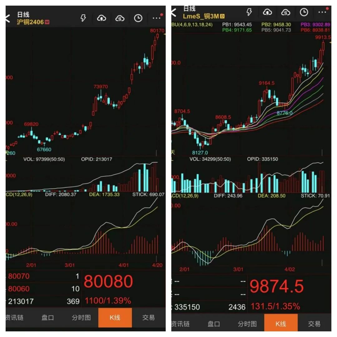 春节过后,铜价持续加速上涨。文华财经数据显示,4月19日夜盘交易时段,沪铜期货主力合约突破80000元/吨,最高至80170元/吨,创下2006年6月以来新高;LME铜价一度触及9913.5美元/吨,创下2022年4月底以来新高。今年以来,两者累计涨幅分别为16.43%、15.33%。