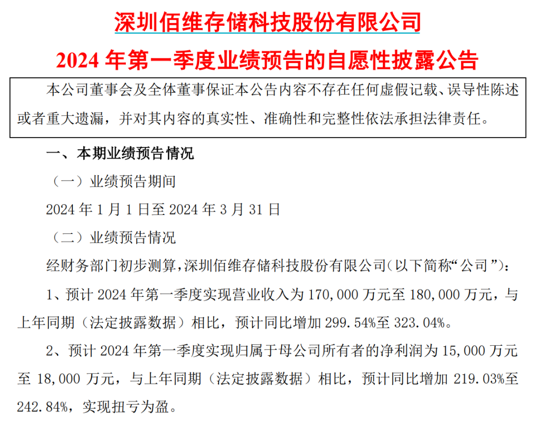 近期披露一季报的佰维存储同样业绩喜人。佰维存储预计2024年一季度实现营收17亿元~18亿元,同比增长299.54%~323.04%;实现归母净利润1.5亿元~1.8亿元,同比增长219.03%~242.84%,扭亏为盈。