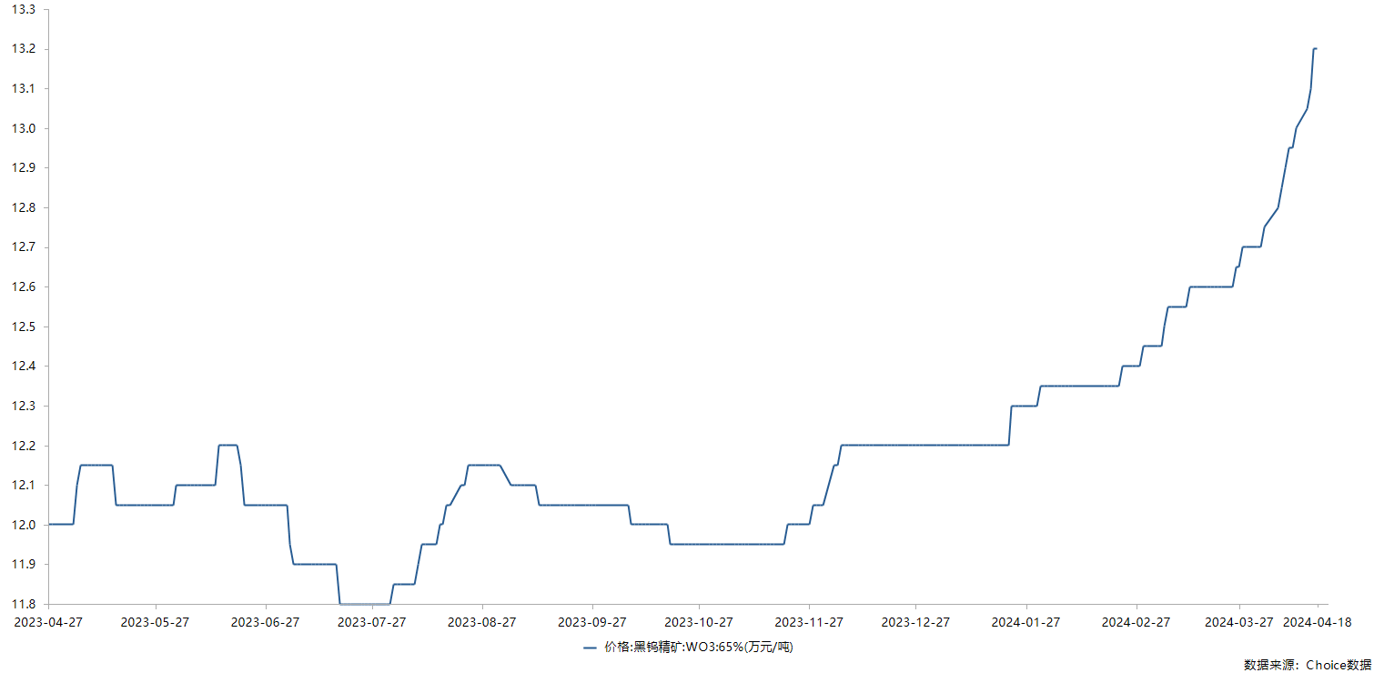 据Choice数据,截至4月19日,黑钨精矿(品位≥65%)均价为13.3万元/吨,为近十年高点。