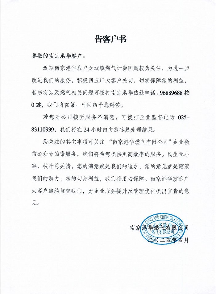 4月21日,南京港华燃气有限公司官微发布告客户书: