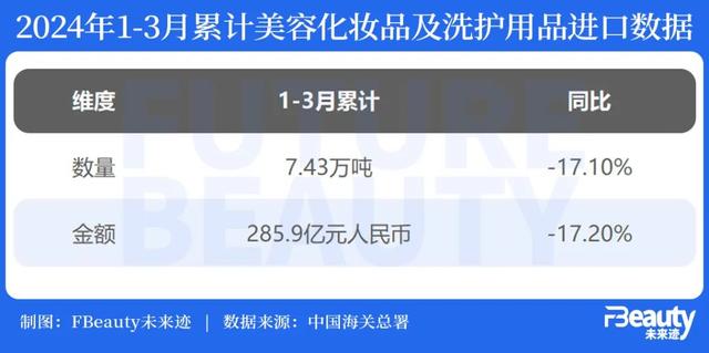 从当前大盘看,进口化妆品的整体态势堪忧。根据国家海关总署最新发布的2024年第一季度的进口数据显示,美容化妆品洗护类产品出现了“量价齐跌”的状态,同比下滑幅度都超过17%。
