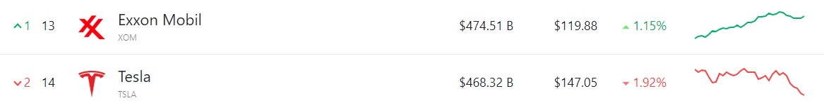 年初至今,埃克森美孚累涨21.02%,市值最新报4745.1亿美元;而特斯拉股价年内累跌40.82%,是标普500指数成分股中表现第二差的个股,市值报4683.2亿美元,两家公司在美国公司市值榜上分别位于第13名和第14名。