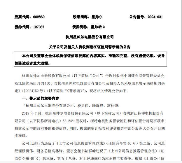杭州星帅尔电器股份有限公司(以下简称"星帅尔")于4月19日晚间发布公告称,公司近日收到中国证监会浙江监管局出具的警示函。公告显示,星帅尔在2019年7月收购浙江特种电机股份有限公司(以下简称"浙特电机")53.24%股权的过程中,存在未披露相关信息以及信息披露不准确等违规行为。对此,浙江证监局决定对星帅尔及相关人员采取出具警示函的监管措施,并记入证券期货市场诚信档案。