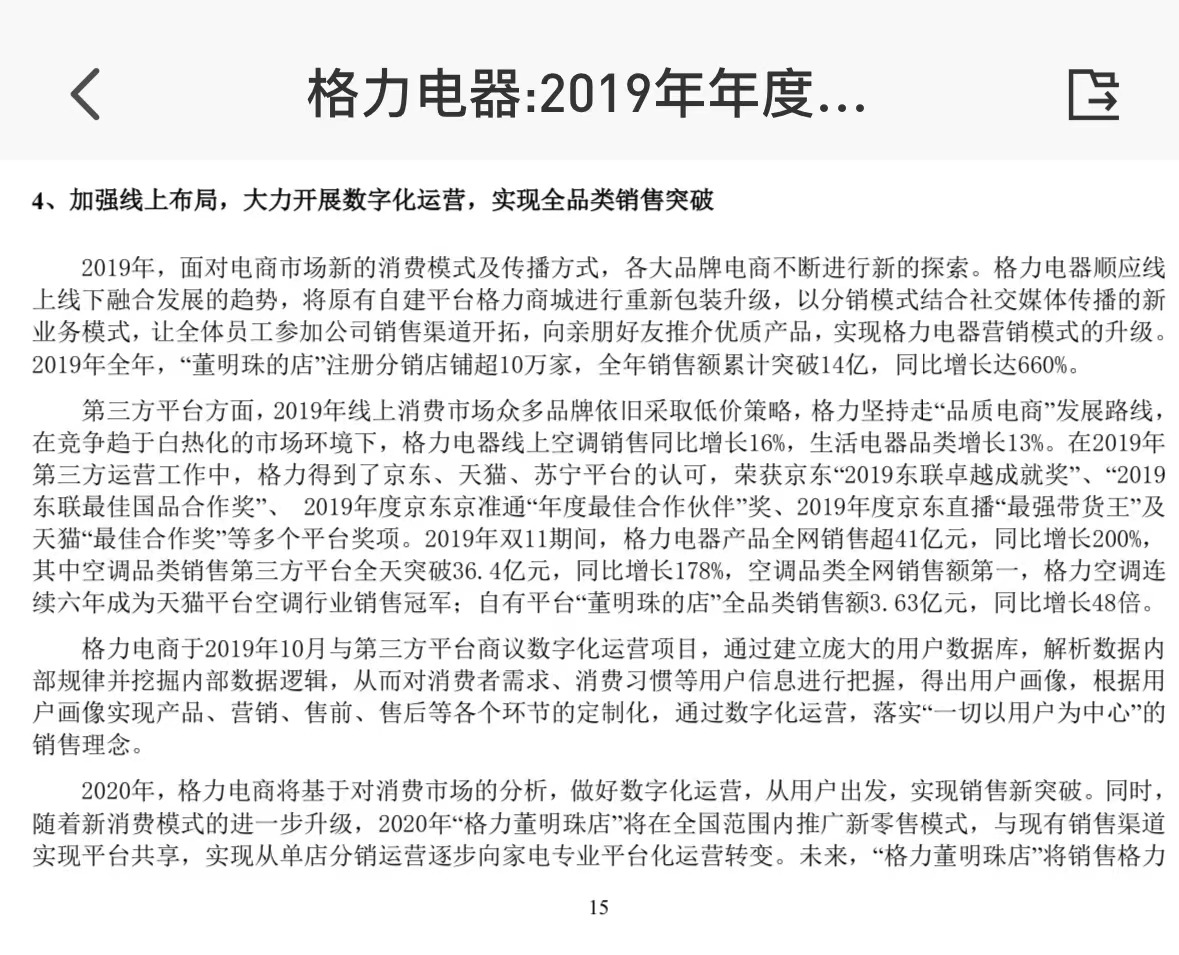 据其2019年年报,格力电器2019年面对电商市场新的消费模式和传播方式,让全体员工参加公司销售渠道开拓,向亲朋好友推介优质产品,实现格力电器营销模式的升级。2019年全年,“董明珠的店”注册分销店铺超过10万家,全年销售额累计突破14亿元,同比增长660%。不过,这在格力电器2019年1981.53亿元的营收中占比仅为0.7%。