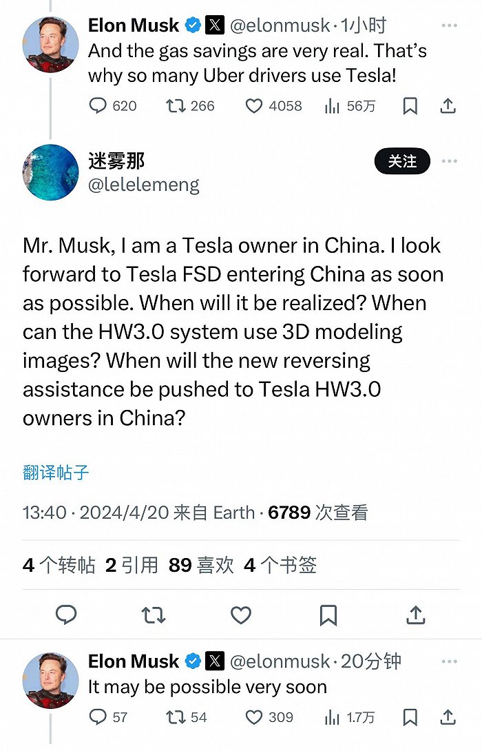 有特斯拉中国车主4月20日在社交媒体上向马斯克提问称,“我期待特斯拉FSD(完全自动驾驶)早日进入中国,不知何时实现?HW3.0系统什么时候能用3D建模图像?新的倒车辅助什么时候能推送给中国的特斯拉HW3.0车主?”对此,马斯克回复称,“可能很快就会实现”。