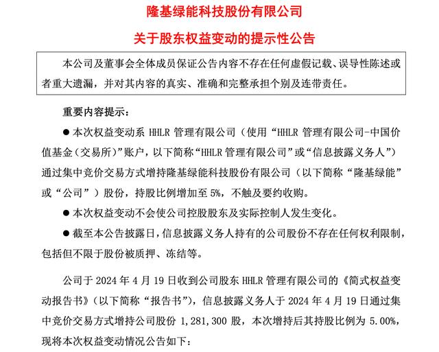 4月19日,隆基绿能(601012.SH)发布公告称,公司股东HHLR管理有限公司(以下简称HHLR公司)发布《简式权益变动报告书》,增持隆基绿能股票。公告发布当天,HHLR公司已完成首次购回,持股比例由4.98%增加至5%。