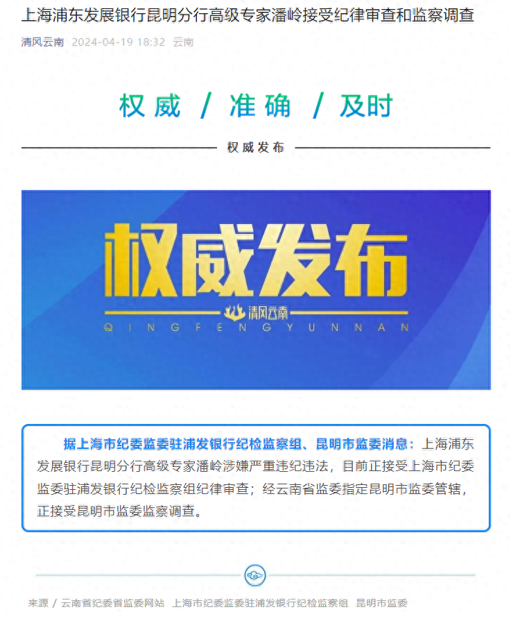 据上海市纪委监委驻浦发银行纪检监察组、昆明市监委消息:上海浦东发展银行昆明分行高级专家潘岭涉嫌严重违纪违法,目前正接受上海市纪委监委驻浦发银行纪检监察组纪律审查;经云南省监委指定昆明市监委管辖,正接受昆明市监委监察调查。