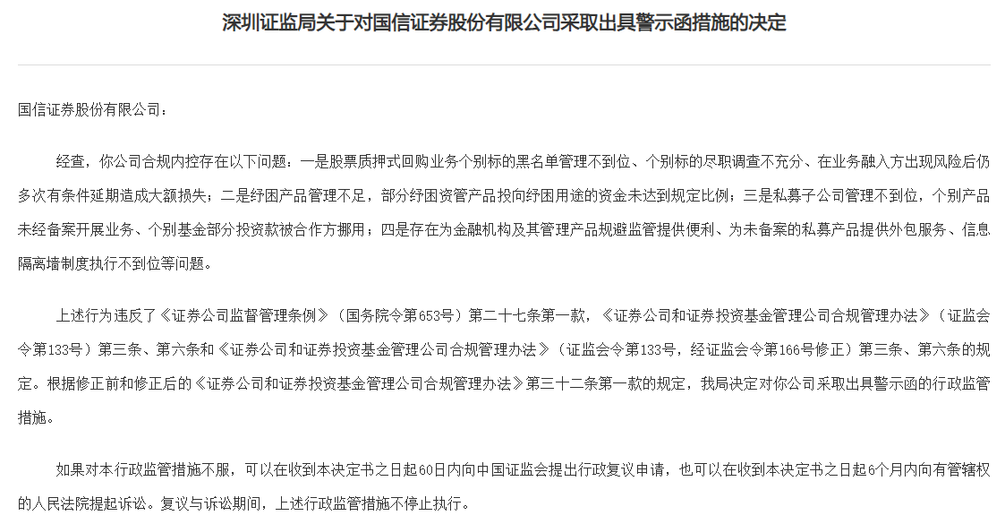 股票质押作为消耗本金的重资本业务,是券商信用业务收入重要来源,但违规事件也频有发生。4月19日,深圳证监局公布一则罚单指向国信证券,主要问题涉及公司合规内控。