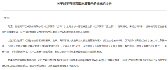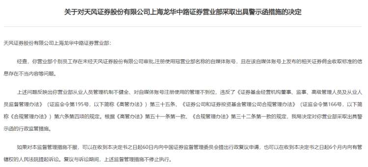 对此,上海证监局决定对天风证券上海龙华中路证券营业部、营业部员工王秀详分别出具警示函。