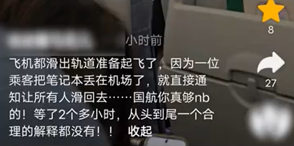 4月19日,北京。多位旅客称飞机滑行时被叫停,因一位乘客把笔记本电脑遗落在机场,所有人下飞机,导致延误近3小时。对此,#国航回应乘客遗落电脑致飞机延误#,刚开始延误是天气原因,后来是有一位乘客原因导致的航班延误,旅客的具体原因无法查询。至于乘客所说的下飞机不清楚原因,确实有延误,对于给乘客带来不好的乘坐体验表示抱歉。