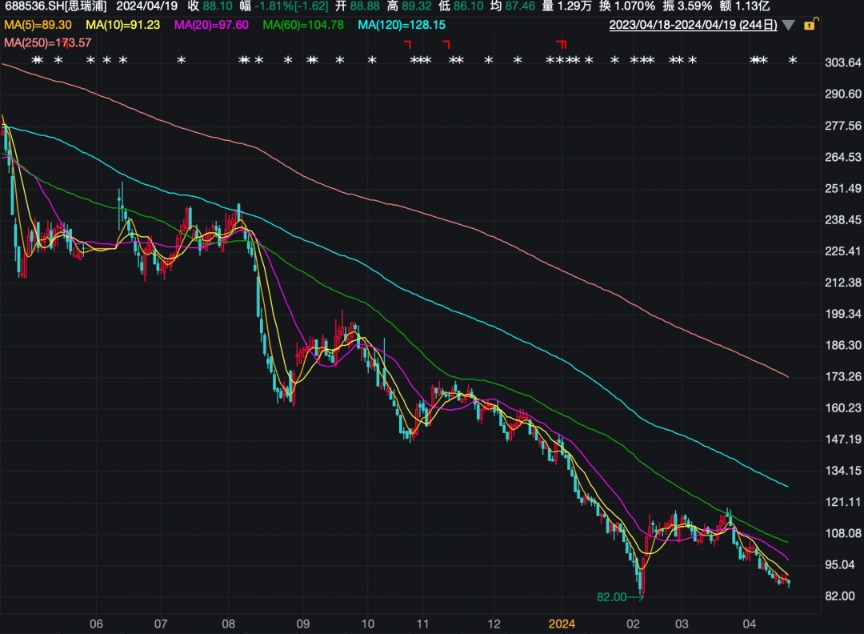 思瑞浦是在2020年9月登陆科创板的,公司股价在2021年12月一度涨至620.81元/股的高位。告别高光时刻以后,该股近年来股价调整非常剧烈,到今年2月曾跌至82元/股的低位,随后有所反弹,但3月下旬到4月继续调整。截至4月19日收盘,思瑞浦报88.10元/股,今年以来下跌了39.78%,最新总市值为116.82亿元。