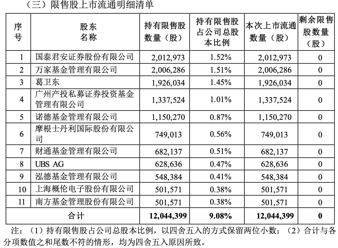 据了解,此次上市流通的限售股,共涉及11名发行对象,包括混沌投资董事长葛卫东,EDA龙头概伦电子,还有国泰君安、万家基金、诺德基金等多家券商、公募,广州产投私募基金,以及摩根士丹利、UBS AG等多家外资。