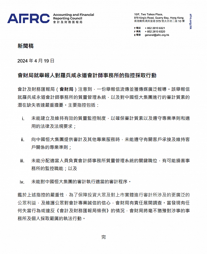 4月19日,香港会计及财务汇报局(以下简称会财局)发布公告称,将对前段时间流传的“普华永道审计恒大失败举报信”内容展开调查。当发现有任何失当行为或违反《会计及财务汇报局条例》的情况,会财局将毫不犹豫对涉事的事务所及个人采取严厉的执法行动。