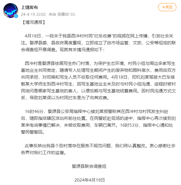 4月19日,@上饶发布 发布情况通报,全文如下: