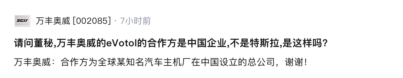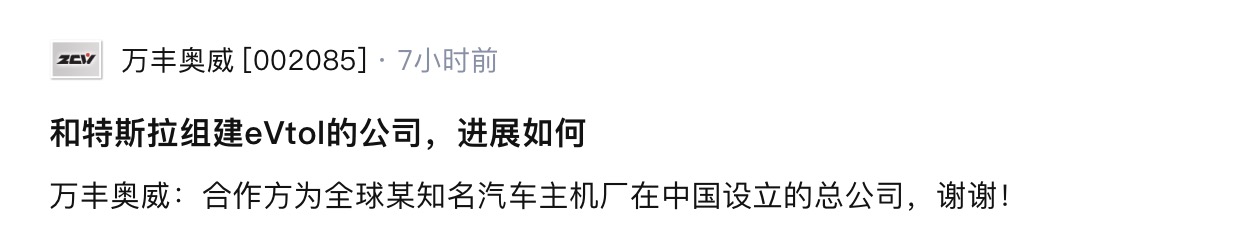 财联社记者注意到,19日的互动平台上,前述“和特斯拉组建eVTOL的公司进展如何”的问题回复已经变成了“合作方为全球某知名汽车主机厂在中国设立的总公司。”事实上,在近日和特斯拉相关的问题回复中,万丰奥威都没有直接予以否认。