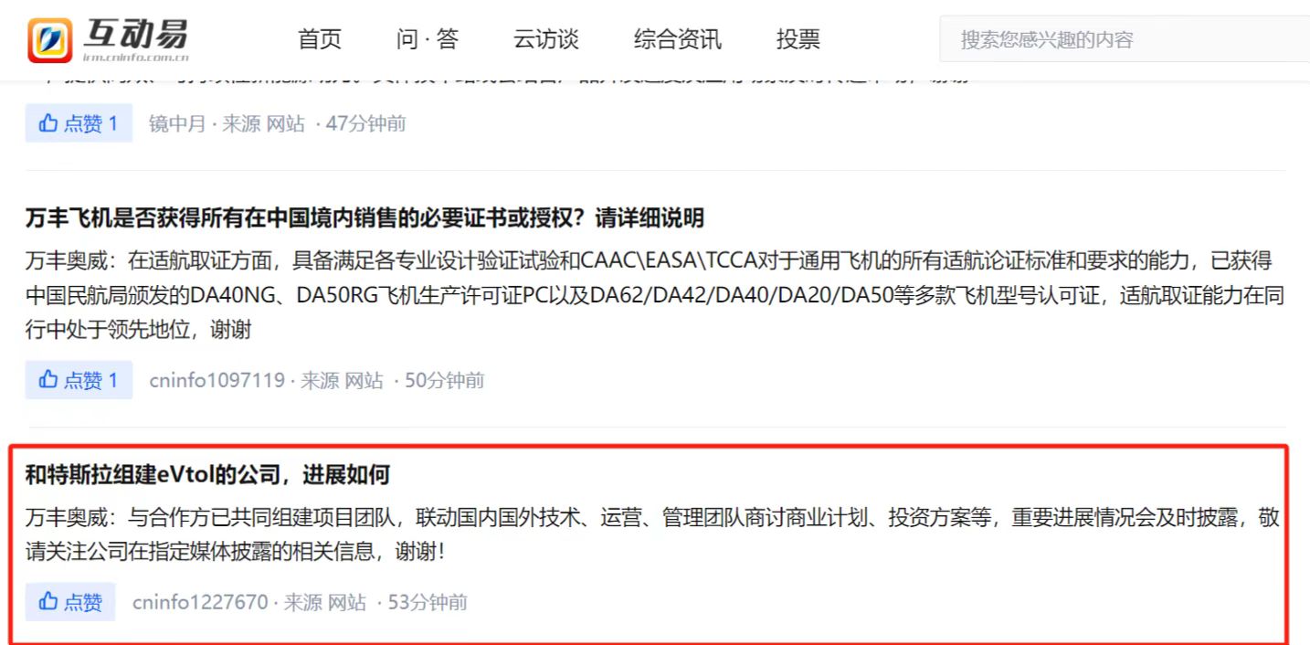 此外,18日-19日,在互动平台上,还有投资者问到“公司eVTOL项目合作方为蔚来汽车是否属实”,“请问公司和吉利、广汽合作的eVtol公司进展怎么样了”,万丰奥威的回应依旧不变:“合作方为全球某知名汽车主机厂在中国设立的总公司”。