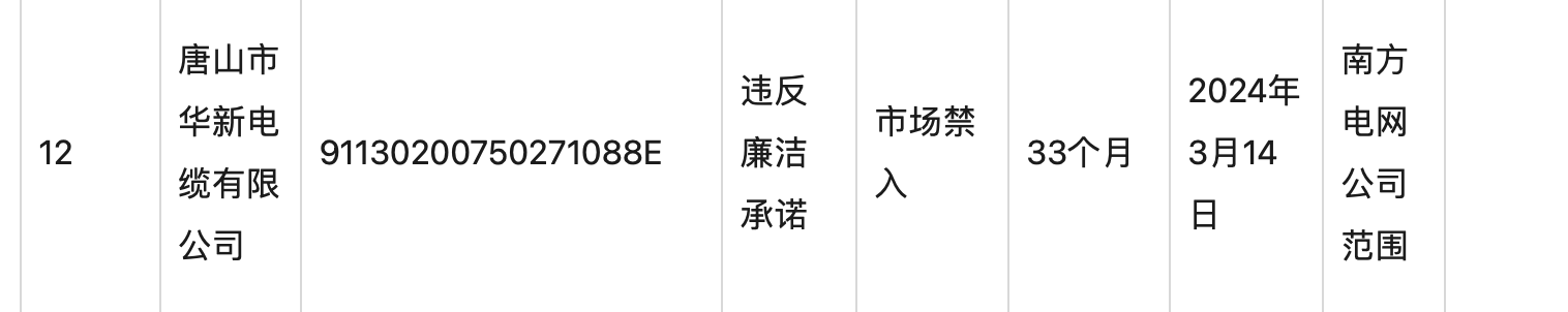 其中,唐山市华新电缆有限公司,违反廉洁承诺,从2024年3月14日起,南方电网公司范围内市场禁入33个月。