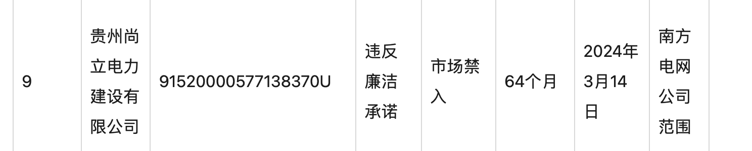 其中,贵州尚立电力建设有限公司,违反廉洁承诺,从2024年3月14日起,南方电网公司范围内市场禁入64个月。