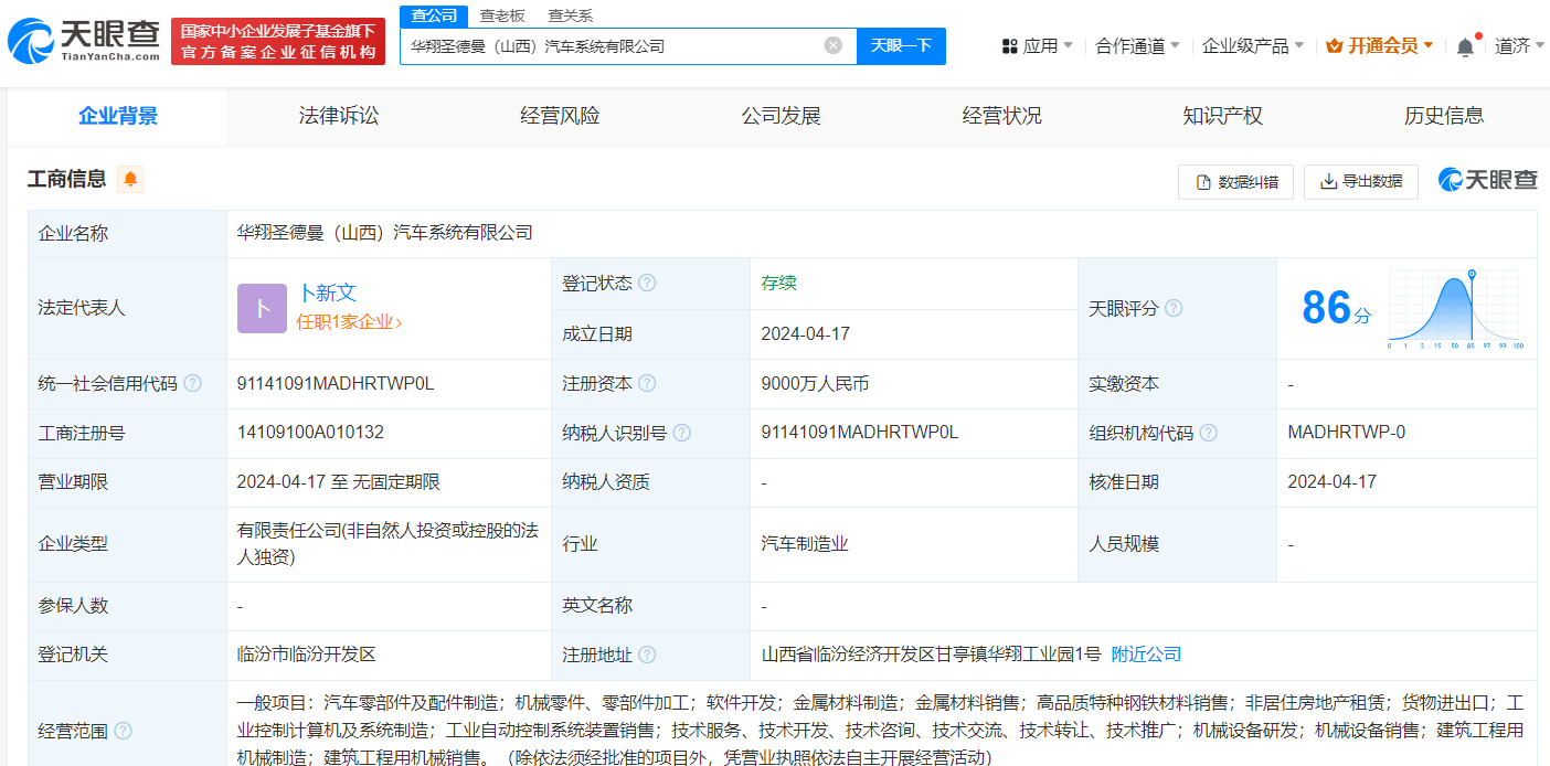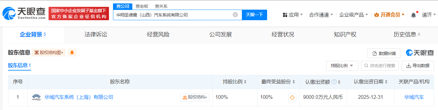天眼查App显示,近日,华翔圣德曼(山西)汽车系统有限公司成立,法定代表人为卜新文,注册资本9000万人民币,经营范围含汽车零部件及配件制造、高品质特种钢铁材料销售、工业控制计算机及系统制造、工业自动控制系统装置销售等。股东信息显示,该公司由华域汽车(600741)旗下华域汽车系统(上海)有限公司全资持股。