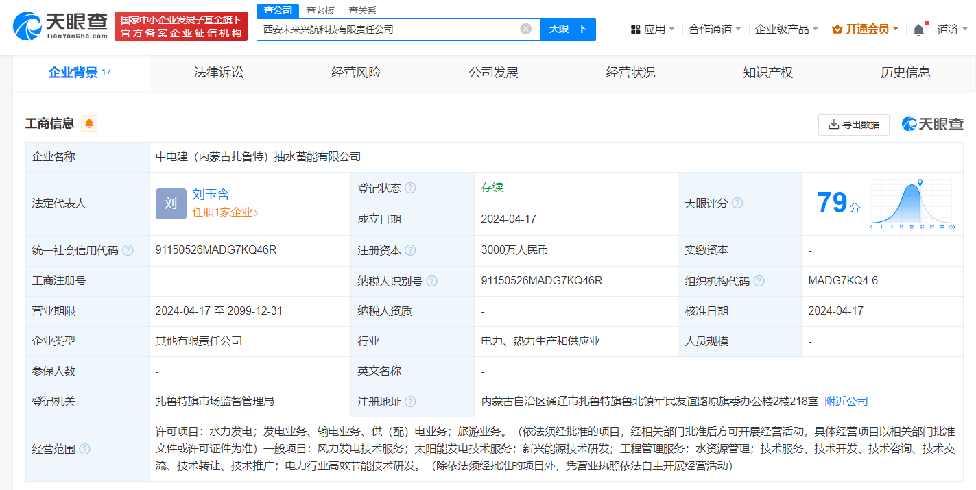 天眼查App显示,近日,中电建(内蒙古扎鲁特)抽水蓄能有限公司成立,法定代表人为刘玉含,注册资本3000万人民币,经营范围含风力发电技术服务、太阳能发电技术服务、新兴能源技术研发、电力行业高效节能技术研发等。股东信息显示,该公司由中国电建(601669)旗下中电建电力投资集团有限公司、中国水利水电第十一工程局有限公司、中国电建市政建设集团有限公司等共同持股。