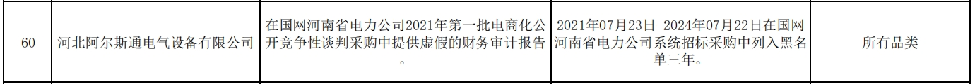 公告中指出,河北阿尔斯通电气设备有限公司在国网河南省电力公司2021年第一批电商化公开竞争性谈判采购中提供虚假的财务审计报告。
