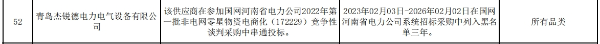 公告显示,青岛杰锐德电力电气设备有限公司在参加国网河南省电力公司2022年第一批非电网零星物资电商化(172229)竞争性谈判采购中串通投标。
