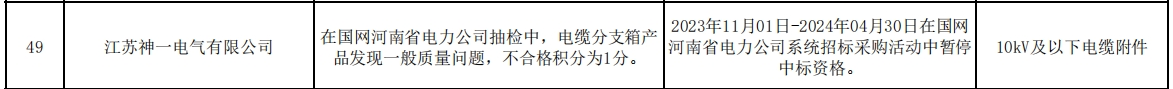 公告显示,江苏神一电气有限公司在国网河南省电力公司抽检中,电缆分支箱产品发现一般质量问题,不合格积分为1分。