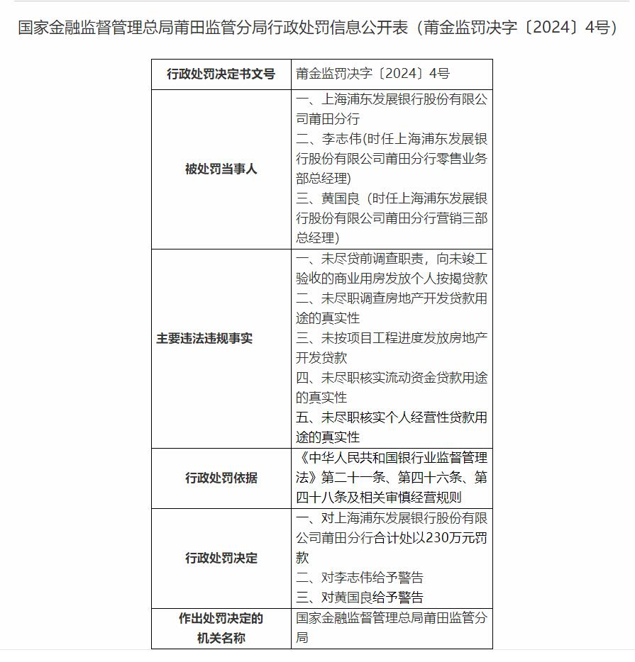 4月17日,国家金融监督管理总局莆田监管分局公开的行政处罚信息显示,上海浦东发展银行股份有限公司莆田分行因存在向未竣工验收的商业用房发放个人按揭贷款等违规,被合计处以230万元罚款。时任上海浦东发展银行股份有限公司莆田分行零售业务部总经理李志伟、营销三部总经理黄国良被警告。
