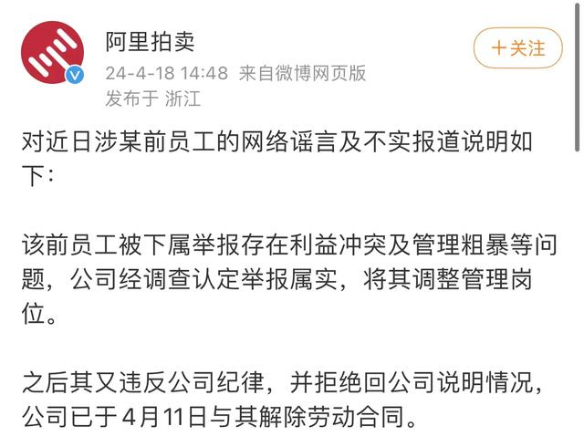 4月18日,针对网络热议的“阿里拍卖前员工指控高管职场霸凌”一事,阿里拍卖官方回应。阿里拍卖官方微博发文称:“该前员工被下属举报存在利益冲突及管理粗暴等问题,公司经调查认定举报属实,将其调整管理岗位。之后其又违反公司纪律,并拒绝回公司说明情况,公司已于4月11日与其解除劳动合同。”