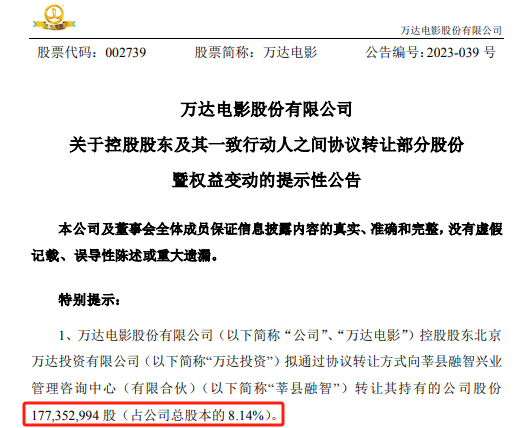 此前,万达系除了转让股权给“儒意系”,还多次转让万达电影股份给其他方。2023年7月10日,万达投资与陆丽丽签署股份转让协议,拟向陆丽丽转让所持万达电影1.8亿股股份,占公司总股本的8.26%,转让价格约21.73亿元。2023年7月18日,万达投资拟向莘县融智兴业管理咨询中心(有限合伙)(简称“莘县融智”)转让所持万达电影无限售条件流通股1.77亿股,占公司总股本的8.14%,转让价格约23.36亿元。