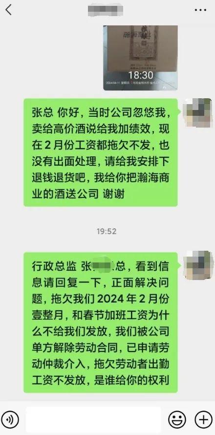 4月17日,在郑州市瀚海海尚工作的陈磊(化名)在河南网上问政新平台“我想@领导”反映称,2024年1月,其公司领导以绩效工资为理由,要求员工购买公司提供的杜康酒。