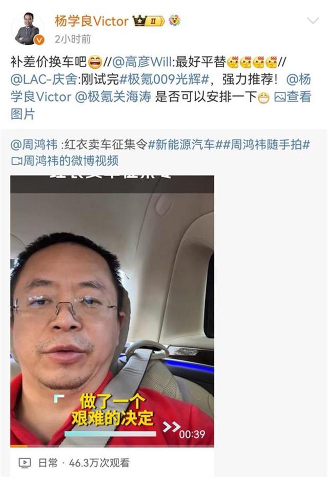 浙江吉利控股集团高级副总裁杨学良转发称“补差价换车吧”,力荐极氪009光辉;哪吒汽车CEO张勇表示:“哪吒L不错啊,送车上门服务,就这个呗!”