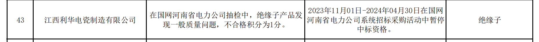 公告显示,江西利华电瓷制造有限公司,在国网河南省电力公司抽检中,绝缘子产品发现一般质量问题,不合格积分为1分。