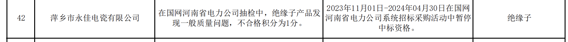 公告显示,萍乡市永佳电瓷有限公司,在国网河南省电力公司抽检中,绝缘子产品发现一般质量问题,不合格积分为1分。