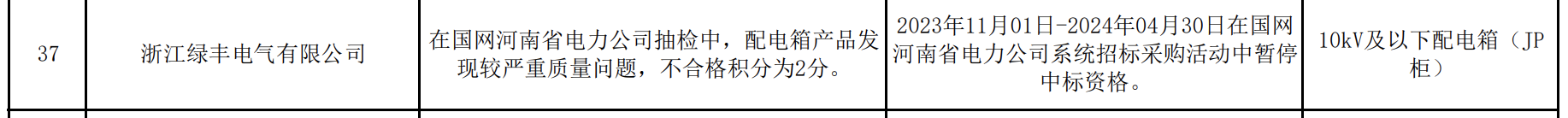 公告显示,浙江绿丰电气有限公司,在国网河南省电力公司抽检中,配电箱产品发现较严重质量问题,不合格积分为2分。