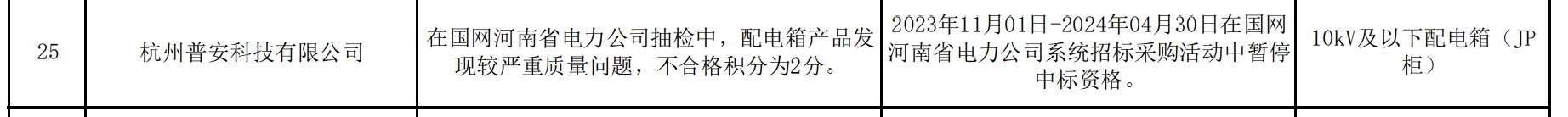 公告显示,杭州普安科技有限公司,在国网河南省电力公司抽检中,配电箱产品发现较严重质量问题,不合格积分为2分。