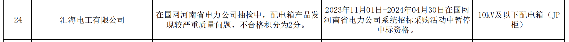 公告显示,汇海电工有限公司,在国网河南省电力公司抽检中,配电箱产品发现较严重质量问题,不合格积分为2分。