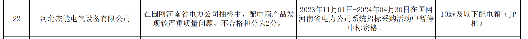 公告显示,河北杰能电气设备有限公司,在国网河南省电力公司抽检中,配电箱产品发现较严重质量问题,不合格积分为2分。