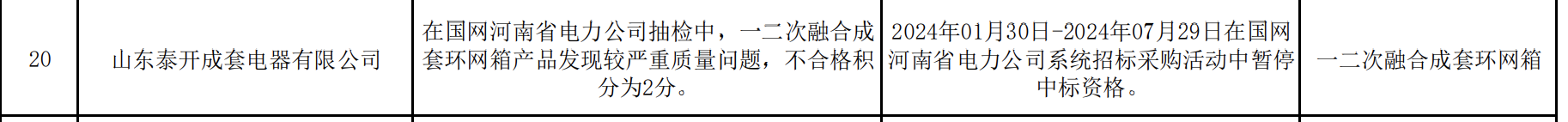公告显示,山东泰开成套电器有限公司,在国网河南省电力公司抽检中,一二次融合成套环网箱产品发现较严重质量问题,不合格积分为2分。