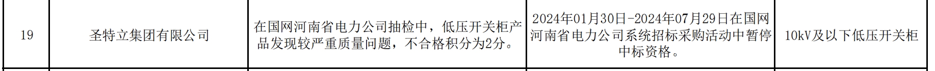 公告显示,圣特立集团有限公司,在国网河南省电力公司抽检中,低压开关柜产品发现较严重质量问题,不合格积分为2分。