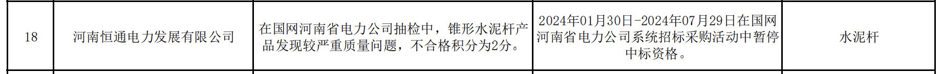公告显示,河南恒通电力发展有限公司,在国网河南省电力公司抽检中,锥形水泥杆产品发现较严重质量问题,不合格积分为2分。