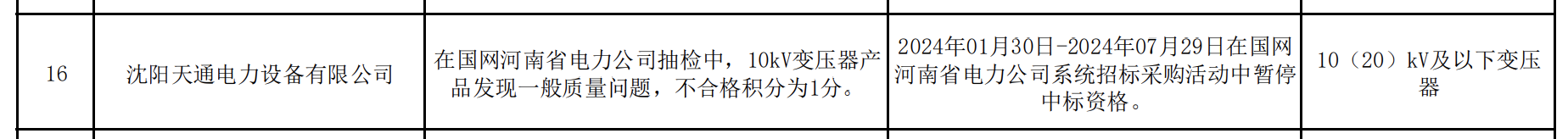 公告显示,沈阳天通电力设备有限公司,在国网河南省电力公司抽检中,10kV变压器产品发现一般质量问题,不合格积分为1分。