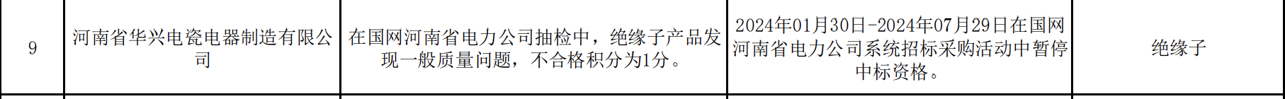 相关处理措施为,2024年01月30日-2024年07月29日在国网河南省电力公司系统招标采购活动中暂停中标资格。处理范围为,绝缘子。